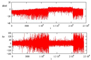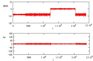 Стандартной процедурой при получении высокого разрешения является согласованная фильтрация отраженного сигнала с использованием копии зондирующего сигнала в качестве импульсной характеристики фильтра. Эта операция обычно выполняется в частотной области с использованием алгоритма БПФ. Восстановленное таким образом изображение с высоким разрешением можно сравнить по интенсивности и фазе с исходным, чтобы оценить искажающее влияние свойств зондирующего сигнала. На рис. 2 и 3 ниже приводятся графики УЭПР отражающей поверхности и ошибки начальной фазы сигнала поверхности как разности фаз исходного сигнала и полученного после съемки и согласованной фильтрации, для ЛЧМ - и ФКМ-сигналов с длиной реализации 8191 элемент. В данном примере УЭПР центрального участка длиной 8192 отсчета на S=8 дБ больше, чем соседних участков.