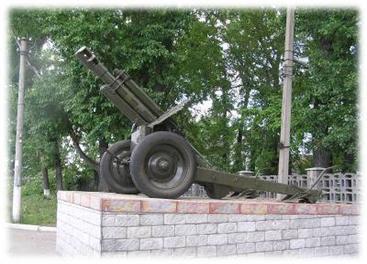 А напротив танка 9 мая 2006 года была установлена гаубица времен Великой Отечественной войны, 1943 года выпуска. Ее привезли из деревни Иковка Курганской области, она принимала участие в самом жестоком сражении 1943г.- Курской битве.
