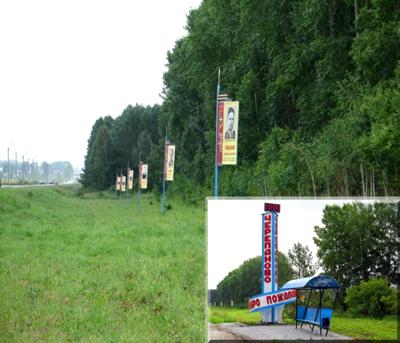 Аллея представляет собой выставленные вдоль дороги щиты с изображением портретов черепановцев – Героев Советского Союза, полных кавалеров ордена Славы.
