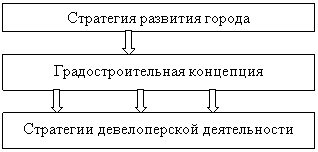 Стратегия девелоперской деятельности определяется в соответствии с направлениями градостроительной концепции, которая, в свою очередь, определяется общей стратегией развития соответствующего городского поселения (рис. 1.)