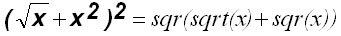 (sqrt(x)+sqr(x)) заключенное в скобках, в котором, что в первом случае с квадратным корнем sqrt, что во втором случае с квадратом sqr аргументом является переменная х.