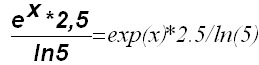В данном примере использовано две простые функции экспонента и натуральный логарифм. Аргументом экспоненты exp является переменная величина х, а для натурального логарифма ln в качестве аргумента использовано строгое значение 5. В остальном выражение оформляется по правилам записи арифметических выражений.