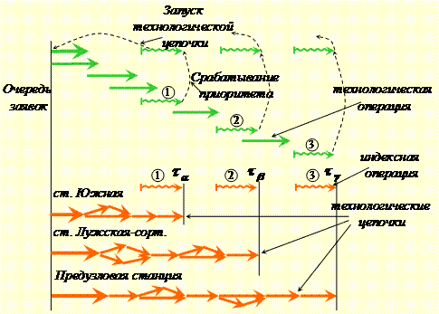 . Индексные заявки 1,2,3 запускают технологические цепочки разной длины заранее с учетом необходимости. Тем самым выстраивается управляемый подвод груза к причалу погрузки.