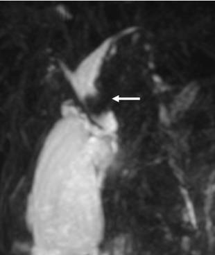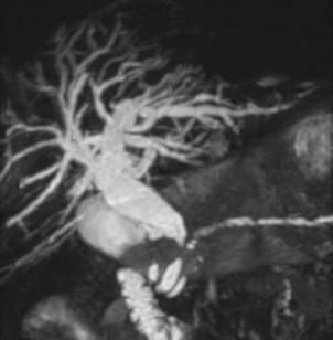 МРТ изображения выполнены 229 больным на томографе «New Intera» с напряженностью магнитного поля 1,5 Т. Пациенты были обследованы в положении на спине, при задержке дыхания с использованием катушки для тела. Сначала выполняли обычные аксиальные Т1-, Т2-взвешенные и коронарные Т2-взвешенные МР изображения верхнего отдела брюшной полости с использованием последовательности Turbo Spin-Echo (TSE) и дополнительные аксиальные Т2- и/или Т1-взвешенные последовательности с подавлением жира (SPIR). Обычные аксиальные изображения служили исходными для выполнения у 211 пациентов МРХПГ. Коронарные МРХПГ изображения были выполнены с использованием multislice heavily Т2-взвешенной TSE последовательности (TR=2 000 мс, ТЕ=700 мс). При невозможности выполнить задержку дыхания использовался режим respiratory-triggering, чтобы уменьшить артефакты от дыхательных движений пациента. После получения исходных МРХПГ изображений были построены 3D-реконструкции с использованием алгоритма проекций максимальной интенсивности (MIP). Общее время получения МР изображений составило приблизительно 30 минут. МРХПГ обеспечила высокую (93,1%) достоверность диагностики заболеваний желчных путей, печени, поджелудочной железы и главного панкреатического протока. При этом метод позволил у ,38%) пациента определить уровень, протяженность и причину обтурации протоковой системы (Рис. 7).