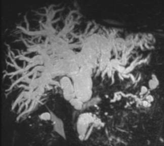 Рис. 2 МРХПГ. Внутрипеченочная желчная гипертензия, гипертензии в протоке поджелудочной железы за счет образования головки поджелудочной железы.