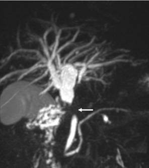 Рис. 3 МРХПГ. Желчная гипертензия. Рубцовая стриктура проксимального отдела общего желчного протока.