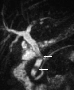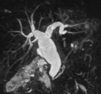 Рис. 4 МРХПГ. Дефекты наполнения (конкременты) в просвете общего печеночного и общего желчного протоков.