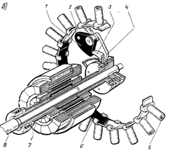 Чувствительным элементом датчика ИД-3 являются три ферромагнитных зонда, закрепленных на платформе под углом 60° и образующих так называемый индукционный треугольник Обмотки подмагничивания всех трех зондов соединены последовательно. Сигнальные обмотки соединены между собой звездой и тремя проводами соединяются со статором сельсина-приемника в коррекционном механизме КМ-8