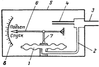 1-манометрическая коробка, 2-подвижный центр коробки, 3 - шкала, 4 - корпус прибора, 5 - трубопроводы полного и статического давлений, 6 - камера статического давления