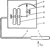 1 - подвижный центр, 2 - манометрическая коробка, 3-штуцер полного давления, 4-передаточный механизм 250К, 5-шкала, 6- стрелка