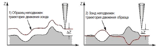 Зонд движется построчно таким образом, что кончик иглы постепенно проходит над всей заданной площадью образца с шагом Δ. Шаг Δ выбирается таким малым, чтобы измерить рельеф поверхности максимально подробно, он не должен превышать диаметр зонда, то есть его разумно выбрать равным 30 – 40 нм. Далее, для сканирования зонда по поверхности образца нет различия между перемещением зонда и обратным перемещением столика с образцом (рис. 5). Технологически в зондовом микроскопе NanoEducator при сканировании в плоскости X, Y организовано перемещение столика, а не зонда. Более того, зонд остается неподвижным и в вертикальном направлении при работе системы обратной связи. Реально происходит не перемещение колонки с зондом, а обратное перемещение столика с образцом.