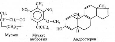 Наиболее подробно исследованы группы душистых веществ с так называемым мускусным запахом. Запах мускусных препаратов, а также способность этих веществ облагораживать и фиксировать композиции запахов обусловили их широкое применение в парфюмерии. В нашем столетии мускус стали получать синтетически. Среди мускусных соединений встречаются представители самых различных химических классов: макроциклические соединения, содержащие замкнутый цикл из метиленовых групп - СН2 - (например, природный продукт мускон, выделенный из мускуса кабарги), ароматические соединения (мускус амбровый) и даже стероидные соединения, близкие по строению к половым гормонам (андростерон).