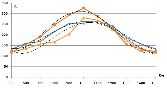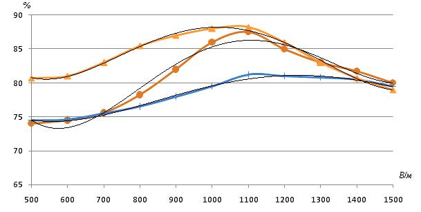 Анализ графиков показывает, что энергия прорастания и всхожесть семян увеличиваются при обработке их в электрическом поле напряженностью около 1100 В/м. Во всех трех сериях опытов наблюдается увеличение этих показателей при указанной напряженности электрического поля, что совпадает с областью максимального увеличения относительного водопоглощения семян при их обработке в электрическом поле.