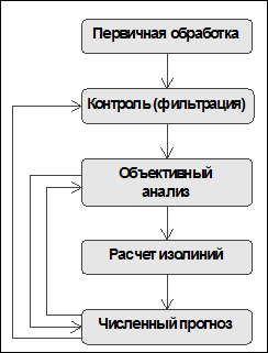 На Рис. 2 показаны основные этапы обработки и интерпретации гидрометеорологической информации. Как видно, основным в этом процессе является этап объективного анализа. В простейшей своей форме объективный анализ состоит в интерполяции значений каждого интересующего исследователя элемента со станций в точки некоторой регулярной сетки (обычно это квадратная сетка на карте той или иной проекции, или широтно-долготная сетка).