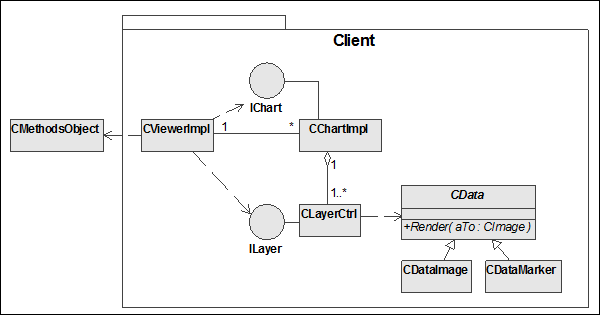 Интерфейс системы выполнен в виде нескольких ActiveX-компонентов. Главным из них является компонент Chart, управляющий изображение диаграммы. В нем выделяется несколько областей, изображение в которых представляет визуальное наполнение диаграммы (область легенды, область палитры, рабочая область).