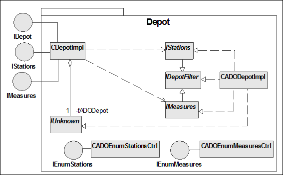 · CADODepotImpl — реализует компонент ADODepot, экспортирующий интерфейсы IStations и IMeasures. Обеспечивает взаимодействие с СУБД посредством технологии ADO.