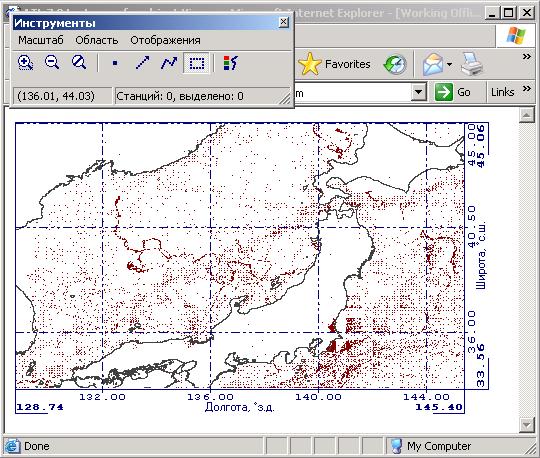 Главная диаграмма системы, автоматически загружаемая в окно браузера, показывает сеть станций (см. Рис. 12). Посредством этой диаграммы пользователь задает интересующею его область, некоторые другие параметры.