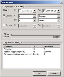 Система содержит несколько диалогов, используемых для модификации различных атрибутов диаграмм. Например, окно «Параметры», представленное на Рис. 14. Оно позволяет пользователю управлять фильтрами выборок (фильтр по времени), просматривать и изменять специфические параметры метода, с использованием которого создается слой.