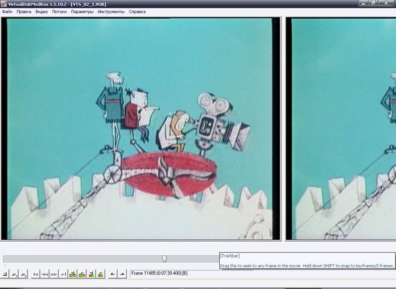 При выполнении этой процедуры нужно помнить следующее. Сжатые видеофайлы содержат кадры различных типов. В ключевых кадрах записано полное изображение, тогда как в промежуточных – только изменения ключевого кадра. Выделяя начало вырезаемого фрагмента черной стрелкой, можно попасть на промежуточный кадр, и тогда начальные кадры видео будут неполными. Резать файл желательно по ключевым кадрам, которые можно обнаружить, нажимая кнопки с желтым ключом в пиктограмме