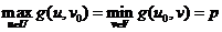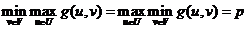 . Если u0 реализует максимум в правой части равенства, а v0 реализует минимум в левой части, то пару (u0,v0) называют седловой точкой, а общее значение левой и правой частей – ценой игры.