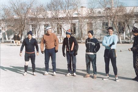 на фото: пилоты одной из смен во время товарищеской встречи по футболу накануне отправки в Афганистан. (плац Каганского гарнизона; на заднем плане казарма ТЭЧ и АЭР)