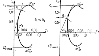 Критические углы атаки у несимметричных профилей по абсолютной величине, как правило, неодинаковы, причем в области отрицательных углов величина