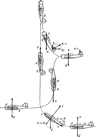 Схема сил, действующих на самолет при выполнении колокола с прямого полета с падением вперед и выходом в прямой полет, показана на Рис. 19.