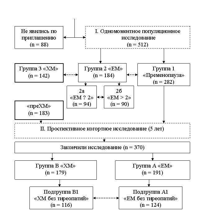 I этап. Для изучения распространенности патологии ЩЖ в перименопаузе в 2002 году проведено одномоментное популяционное исследование 512 женщин в возрасте 45 – 55 лет (Ме [25; 75] = 49 [47,0; 52,0] лет), выбранных случайным способом по базе данных обязательного медицинского страхования из числа проживающих в г. Екатеринбурге. Среди обследованных женщин были выделены следующие группы (рис. 1):