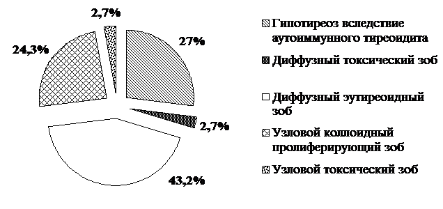 1. В регионе с дефицитом йода функциональные и/или морфологические изменения щитовидной железы встречаются почти у каждой второй женщины в возрасте 45 – 55 лет. Чаще всего регистрируются узловой коллоидный пролиферирующий зоб (17,4 %) и гипотиреоз вследствие аутоиммунного тиреоидита (14,5 %). Заболевания щитовидной железы, связанные с дефицитом йода (диффузный эндемический зоб, узловой коллоидный пролиферирующий зоб, узловой токсический зоб), выявляются в 1,4 раза чаще, чем аутоиммунные тиреопатии (ДТЗ и гипотиреоз вследствие АИТ) (р = 0,03).