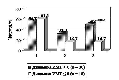 В стандартных рекомендациях по контролю за массой тела для уменьшения риска развития ассоциированных с ожирением метаболических нарушений обычно рекомендуется снижение массы на 5 – 10 %. По нашим данным, при исходном ИМТ > 25 кг/м2 отсутствие увеличения массы тела или ее снижение на 4,5 % уменьшало риск развития метаболического синдрома в 3 раза, нарушения толерантности к глюкозе или сахарного диабета 2 типа – в 2 раза (рис. 9), способствовало уменьшению атерогенных изменений липидов (рис. 9).