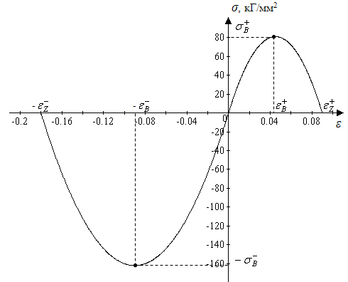 Свойства материала, из которого изготовлена балка, определяет полная диаграмма деформирования σ(ε), обладающая восходящей и падающей до нуля ветвями. Диаграмму характеризует функция