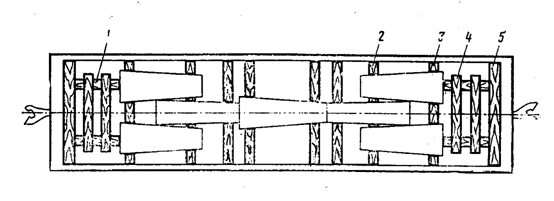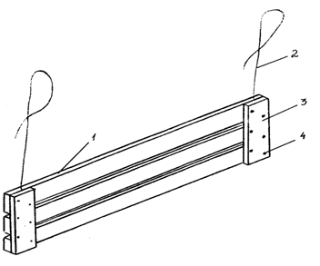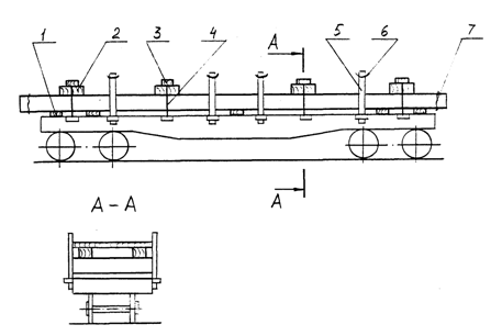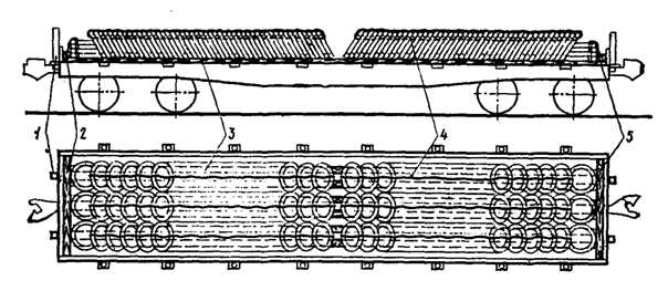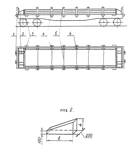 1- продольные прокладки; 2- клинообразные бруски; 3- стойки; 4- проволочные увязки изложниц; 5- проволочные растяжки