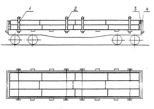 4.6.8.1. Изложницы массой до 6,7 т в количестве от 9 до 11 штук (рисунок 4.6.36) укладывают на платформе на два ряда подкладок сечением 25х200 мм и длиной не менее 2000 мм так, чтобы стыки подкладок, находящихся в одном ряду, приходились между изложницами. Каждую подкладку прибивают к полу платформы тремя гвоздями длиной не менее 75 мм. Изложницы устанавливают поперек платформы вплотную друг к другу. С наружных сторон крайние изложницы подбивают двумя клинообразными упорными брусками размерами 150Х250 мм. Эти бруски укладывают на подкладки вдоль платформы и прибивают к полу (четыре подкладки) каждый четырьмя гвоздями длиной не менее 150 мм. Каждую крайнюю изложницу укрепляют двумя растяжками из проволоки диаметром 6 мм в шесть нитей. Растяжки прикрепляют к приливам изложниц. Каждые три изложницы, расположенные по концам платформы, увязывают между собой за имеющиеся на них скобы проволокой диаметром 6 мм в шесть нитей.