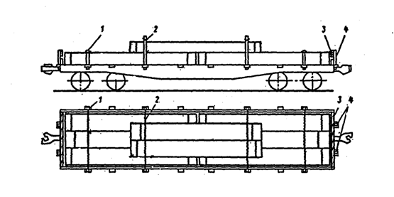 4.6.2.8. Связки сортового металла длиной мм размещают, как правило, в полувагонах с глухими торцами длиной до 12700 мм без подкладок и щитов ограждения. Допускается размещение и крепление связок в два яруса на платформе согласно рисунку 4.6.6.