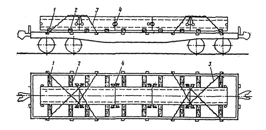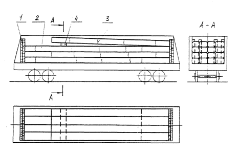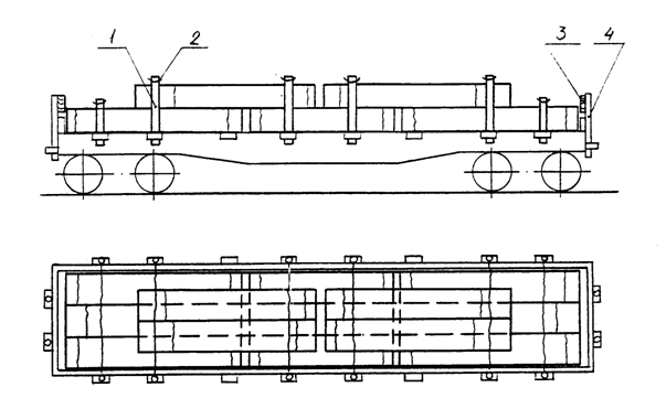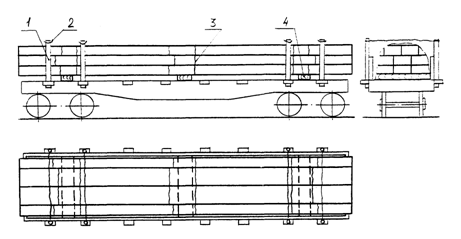1- подкладки; 2- поперечные упорные бруски; 3- растяжки; 4- увязка изложниц