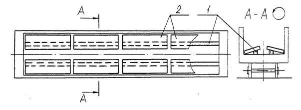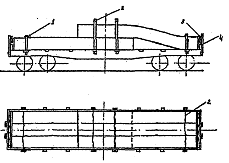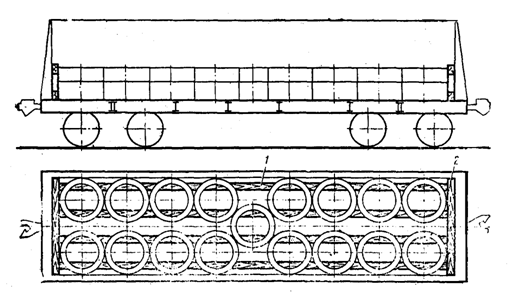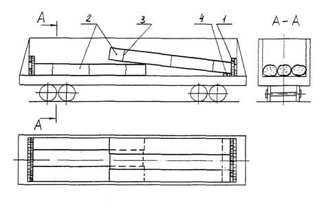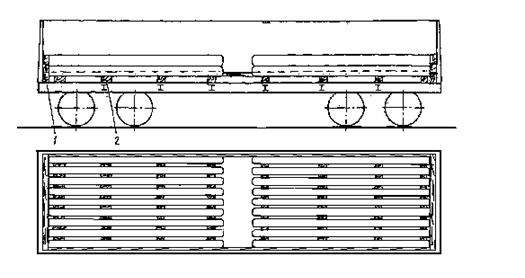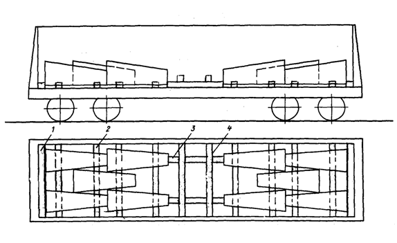 4.6.7.2. Блюмсы длиной 2мм укладывают в полувагоне на восемь подкладок сечением 70Х100 мм и длиной, равной ширине полувагона. Две крайние подкладки укладывают между гофрами крышек люков в концевой части полувагона, при этом концы их опираются на полки продольных угольников нижней обвязки полувагона. Остальные подкладки укладывают на шкворневые и промежуточные поперечные балки полувагона.