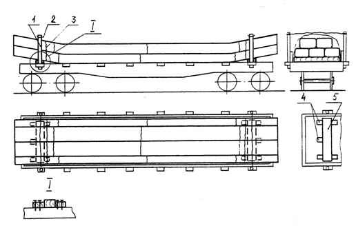 4.6.8.2. Погрузка и крепление изложниц массой от 6,7 до 12,5 т на платформы показаны на рисунке 4.6.38. Если не используется грузоподъемность вагона, то в середине платформы изложницы могут устанавливаться по две вдоль вагона симметрично продольной оси.