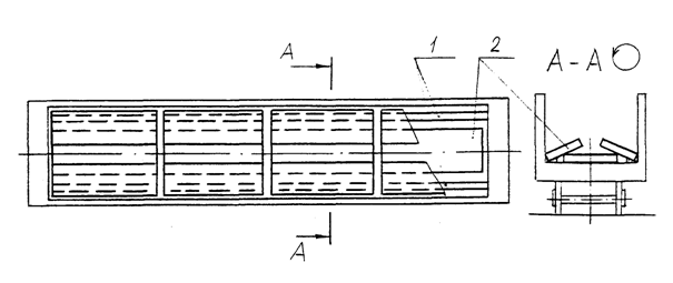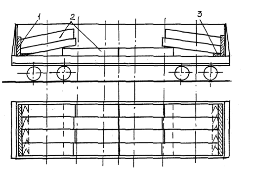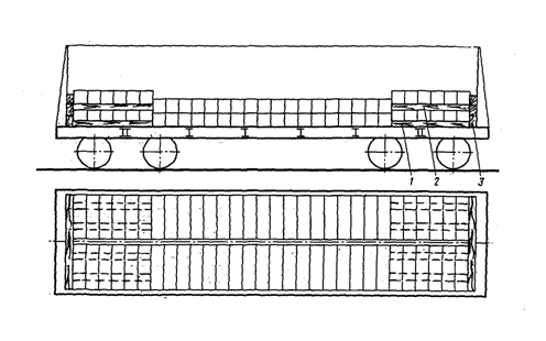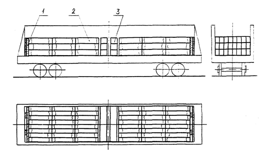 Квадратную заготовку в связках длиной мм, размещают по длине полувагона без подкладок тремя штабелями (рисунок 4.6.11), каждый в несколько ярусов. Погрузку ведут от хребтовой балки к боковым стенкам полувагона. При этом двери полувагона ограждают торцовыми деревянными щитами.