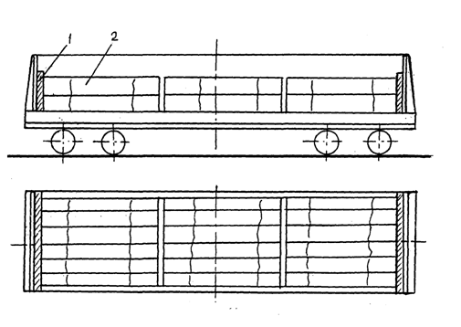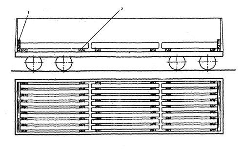 Квадратную заготовку поштучно или в связках длиной мм укладывают в полувагон со смещением заготовок к дверям по ярусам (рисунок 4.6.13). Под верхний ярус на расстоянии 1 м от конца заготовок укладывают прокладку-упор толщиной 100-120 мм из горбыля или досок, скрепленных гвоздями. Двери полувагона ограждают усиленными щитами.