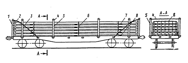 1- боковые стойки; 2- увязка; 3- обвязка штабеля; 4- упорные бруски; 5- подкладки; 6- костыли
