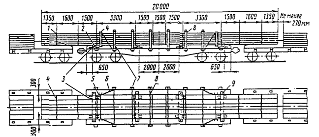 4.6.2.2. Связки длиной до 6500 мм (профиль до 180 мм) размещают на платформе в два и несколько штабелей в один или два яруса каждый (рисунок 4.6.2).