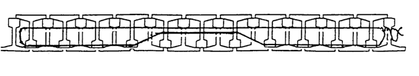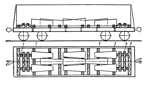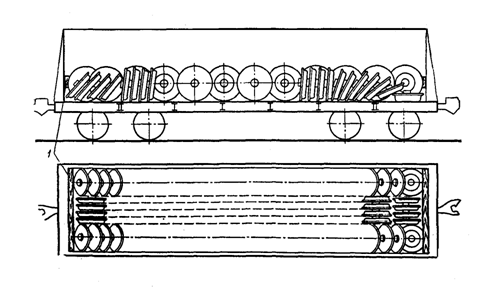 Средний ряд состоит из секций по четыре колеса, которые ставят вплотную к брускам, прибитым к торцовым дверям четырьмя гвоздями диаметром 6 мм, длиной 150 мм. Сечение бруска 100х 100 мм, длина 2800 мм. Гребни одной секции колес направлены в одну сторону, а гребни следующей секции - в противоположную.