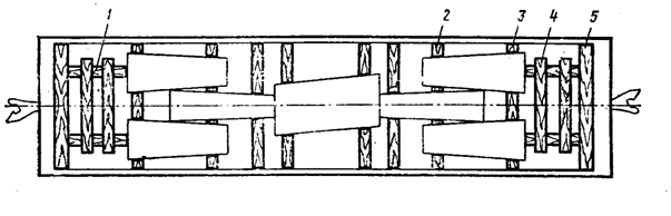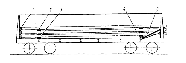 1- торцовые стойки; 2- поперечный упорный брусок; 3- продольные подкладки; 4- увязка рядов рулонов; 5- увязка рулонов, уложенных плашмя