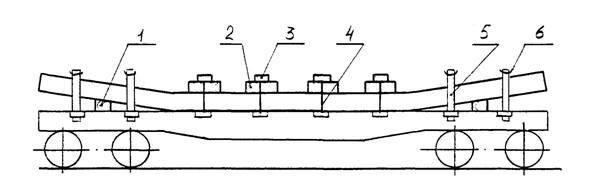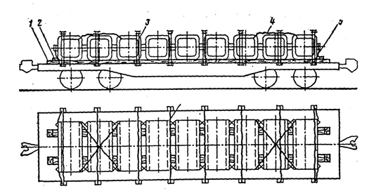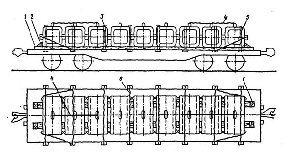 1- поперечная прокладка; 2- распорные бруски; 3- торцовые стойки; 4- увязка крайних бандажей со стороны лобового бруса; 5- увязка вертикально установленных бандажей; 6- боковые стойки