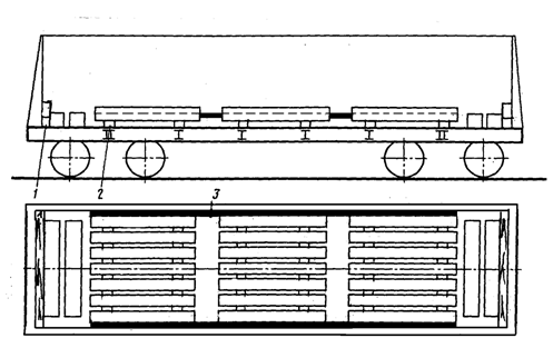 1- ограждающий щит; 2- связки металла; 3- связки металла, уложенные поперек вагона
