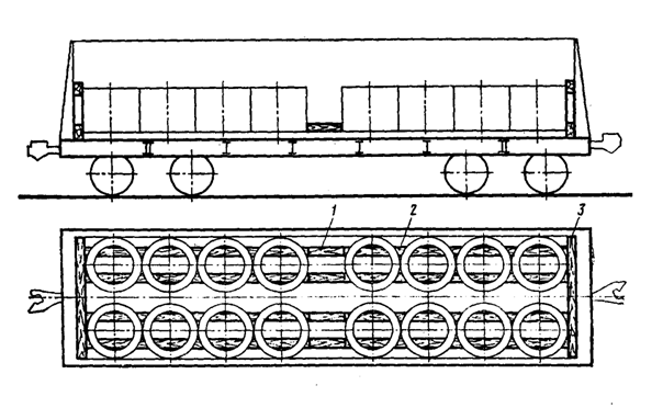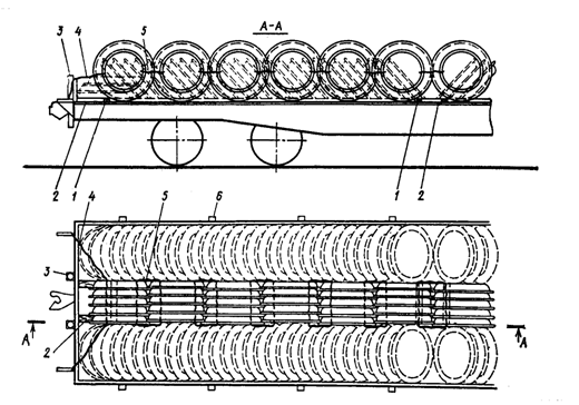 4.6.13.1.5. Трубы диаметром до 450 мм при длине погрузки более расстояния между крайними боковыми стоечными скобами с каждой торцовой стороны платформы ограждают двумя стойками, к которым с внутренней стороны до высоты верхнего яруса труб прибивают гвоздями длиной не менее 100 мм доски и горбыли толщиной 50 мм, равные внутренней ширине платформы. Зазоры между досками располагают по стыкам каждых двух ярусов труб. Зазоры должны быть менее диаметра погруженных труб. Торцовые стойки и поперечный брус крепят проволокой диаметром 6 мм в шесть нитей за вторые от торцов боковые стоечные скобы.
