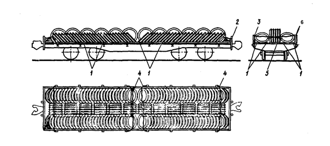 1- продольные бруски; 2- торцовые стойки; 3- распорные бруски; 4- проволочные увязки; 5- поперечная прокладка; 6- короткие стойки
