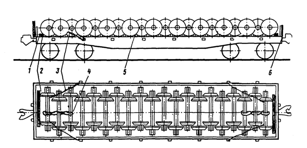 В двух крайних рядах каждый полуряд наклонно уложенных бандажей (от торцового борта до середины платформы) увязывают проволокой диаметром 6 мм в две нити, которую пропускают через отверстия бандажей и закрепляют за стоечные скобы. Концы одной из увязок закрепляют за стоечные скобы на одной боковой стороне платформы, концы другой увязки - на другой. Бандажи, установленные вертикально вдоль платформы, взаимно увязывают во всех местах соприкосновения их друг с другом гребнями и поверхностями катания. Ближайшие к торцовым бортам бандажи (из числа установленных вертикально) увязывают за кронштейны на концевых балках рамы.