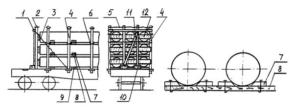При высоте погрузки труб до 2000 мм боковые стойки крепят верхней и средней увязками из проволоки диаметром 6 мм в восемь нитей, при высоте погрузки более 2000 мм - верхней и двумя средними увязками из проволоки диаметром 6 мм в шесть нитей.