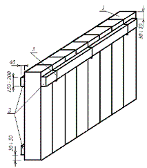 1 – верхнее скрепление стоек; 2 – стойка; 3 – доска; 4 – соединительная доска; 5 – удлиненная прокладка; 6 – упорный брусок